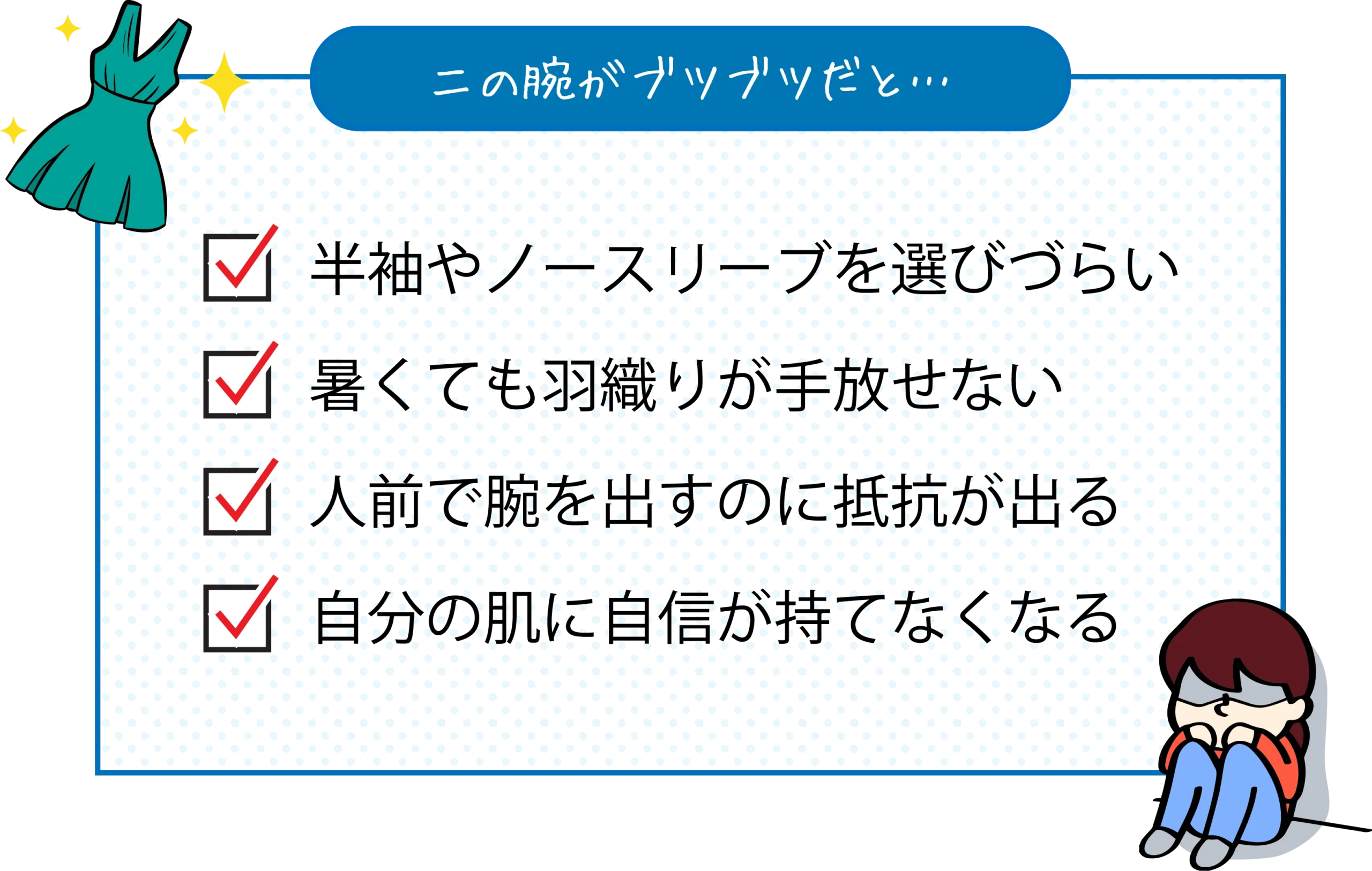 二の腕のぶつぶつは単に乾燥しているだけではなく、古い角質や皮脂が毛穴まわりにたまり肌が乱れた状態が関係します。